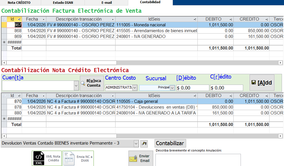 - Al confirmar en TOTALIZAR genera la Nota Credito Electronica, firmela y la envia a la DIAN