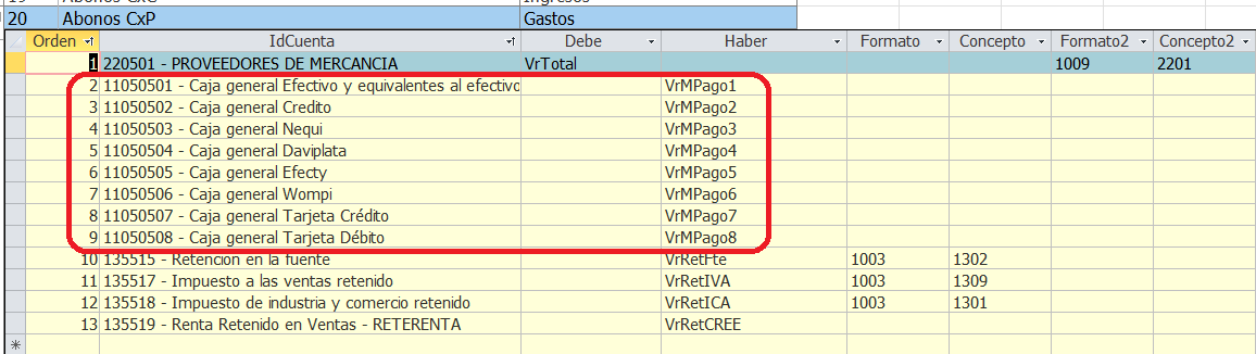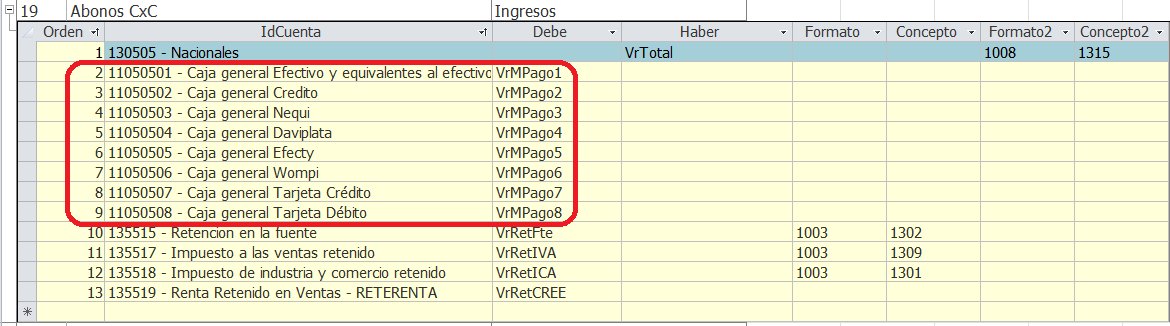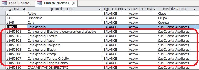 Debajo de la cuenta 110505 deben aparecer las cuentas relacionadas con los medios de pago del 1 al 8.