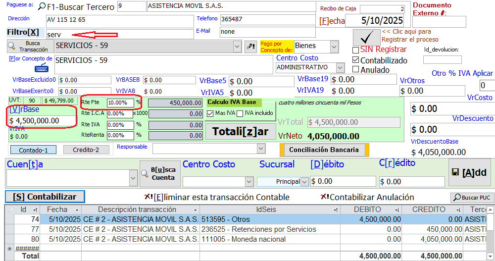 Ejercicio #2: Pago de Servicios a ASISTENCIA MOVIL S.A.S. x $4.500.000 Y ReteFuente del 10 %