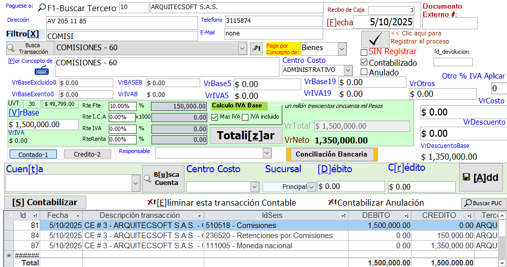 Ejercicio #3: Pago de COMISIONES a ARQUITECSOFT S.A.S. x $1.500.000 Y ReteFuente del 10 %