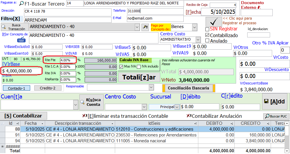 Ejercicio #4: Pago de ARRENDAMIENTO a LONJA ARRENDAMIENTO Y PROPIEDAD RAIZ DEL NORTE. x $4.000.000 Y ReteFuente del 4 %