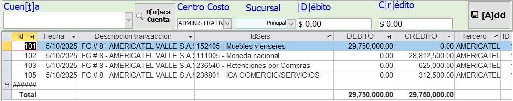 Ejercicio #7: Compra a AMERICATEL VALLE S.A.S Equipos de oficina para uso de los empleados de la empresa por valor de $25.000.000 + IVA 19% ( RteFte x 2.5 y RteICA x 12.5 )