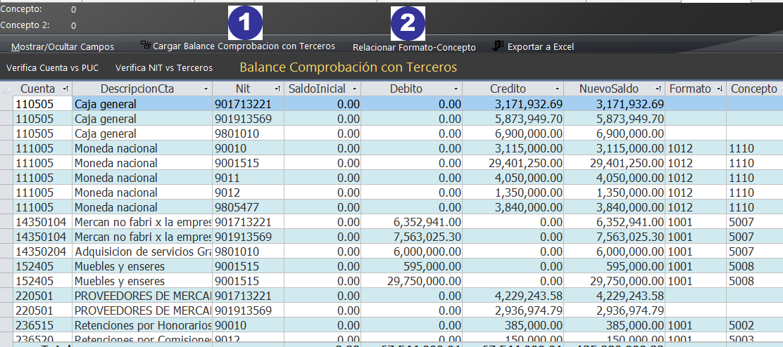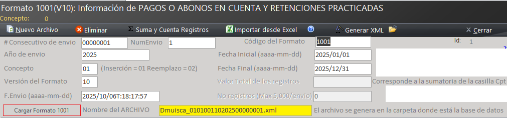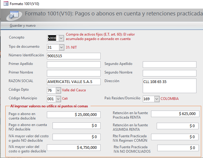 Continuando con el ejercicio vamos a generar el formato 1001 con la información que tenemos hasta el momento: