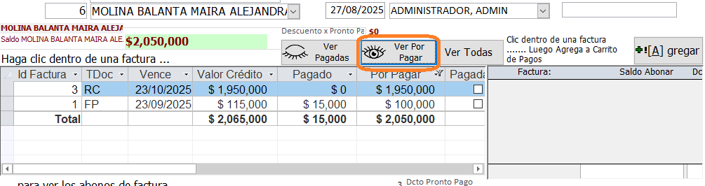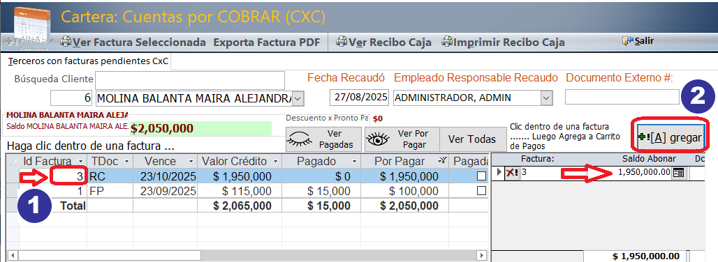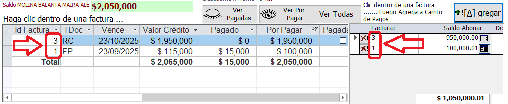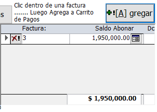 Automáticamente traslada el saldo TOTAL de la Factura al carrito de pagos En el ejemplo la factura #3 tiene una deuda por $1.950.000 |