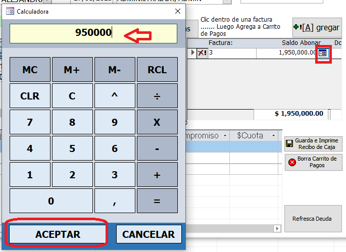 Puede EDITAR el saldo a pagar cambiandolo manualmente o haciendo clic el el botón de la Calculadora, para el ejercio se abona sólo 950.000, quedaría con un saldo de 1.000.000 |