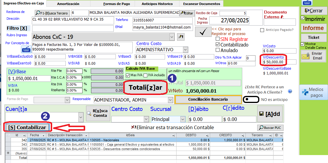Dentro del recibo de caja puede aplicar descuentos por pronto pago
