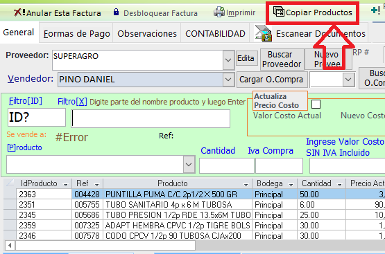 Ahora para actualizar el Precio de Venta Se procede a copiar sólo los productos de esta factura al portapapeles de inFaCont 1. Clic en el botón Copiar Productos |