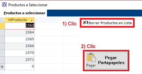 2. Si existen productos en lista, 1) clic en Borrar Productos en Lista y 2) luego Clic en Pegar Portapapeles |