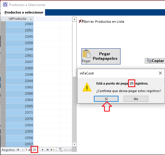 3. Confirme que van a pegar los 21 productos al portapapeles de inFaCont |
