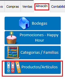 Luego clic en la pestaña Almacén y luego en el botón Productos/Artículos