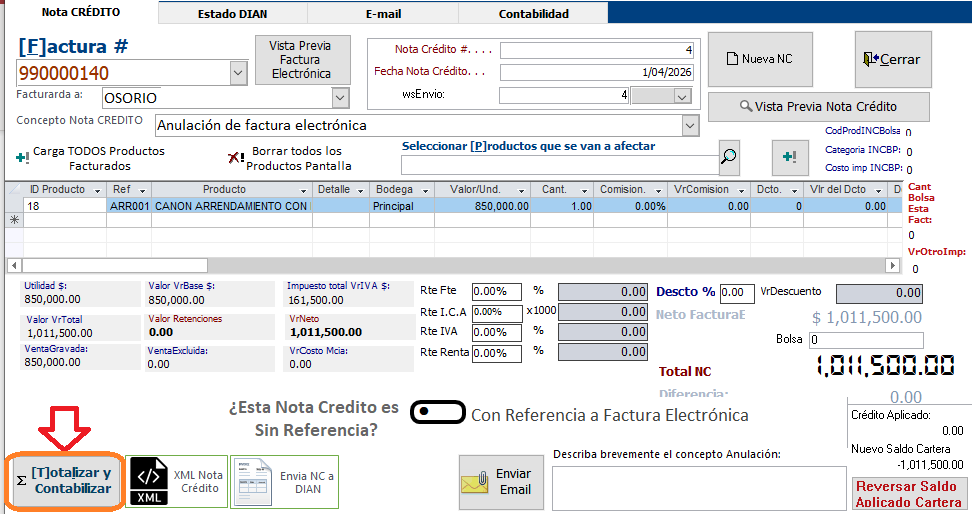 - Al confirmar en TOTALIZAR genera la Nota Credito Electronica, firmela y la envia a la DIAN