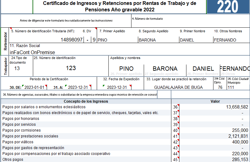 Al generar el certificado automáticamente inFaCont diligencia las casillas del formulario 220, tomando los datos de la nómina electrónica