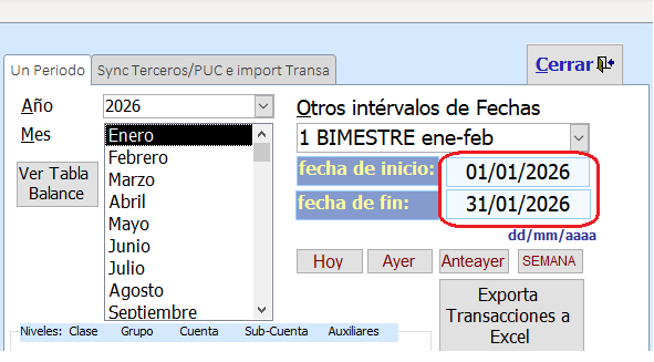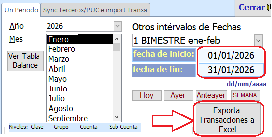 Este modulo opera desde el formulario [Intervalo de fechas Contable] y no requiere tener Microsoft Excel instalado en los equipos.