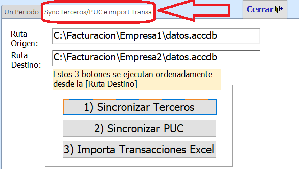 IMPORTANTE: Orden recomendado: 1) Sincronizar CuentasPUC -> 2) Sincronizar Terceros -> 3) Exportar Transacciones (origen) -> 4) Importar Transacciones (destino)