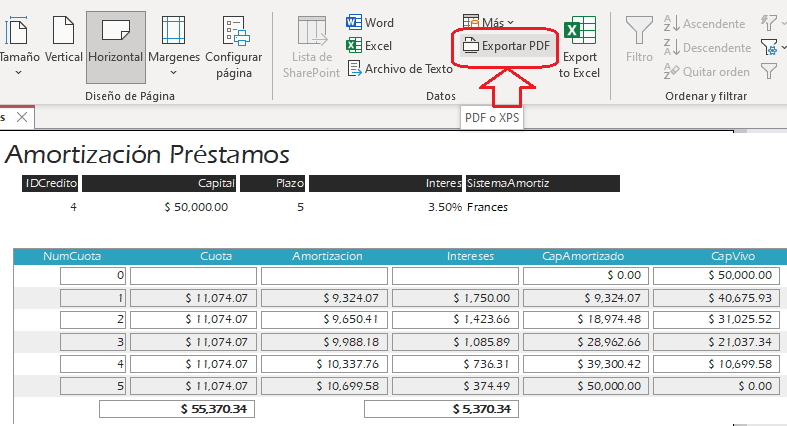 Este reporte se exporta a PDF por que lo vamos a estar consultando constantemente cada mes para conocer el valor del interes segun la cuota que se vaya a pagar