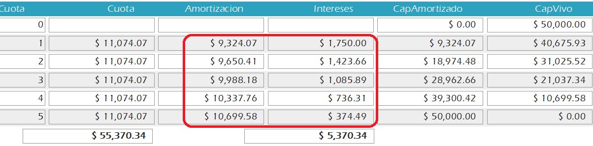 Ejercicio: El banco nos concede un prestamo por $50.000, con un tipo de interes anual de 3.5% a devolver en 5 cuotas.