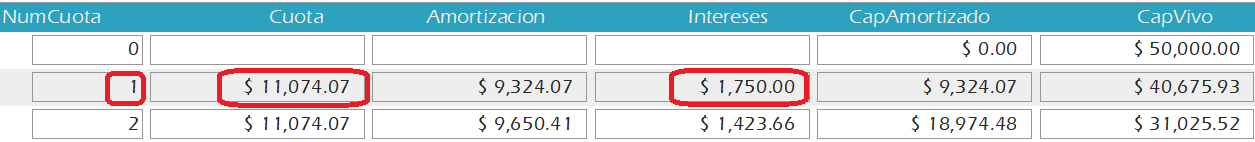 Según la tabla de amortización el interés para la Cuota #1 = $1.750