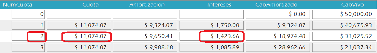 El pago de la cuota #2 seria: Cuota fija: $ 11.074.07 e Intereses: $1.423.66