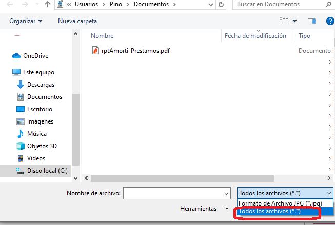 Seleccione todos los registros (*.*) busque y cargue el PDF