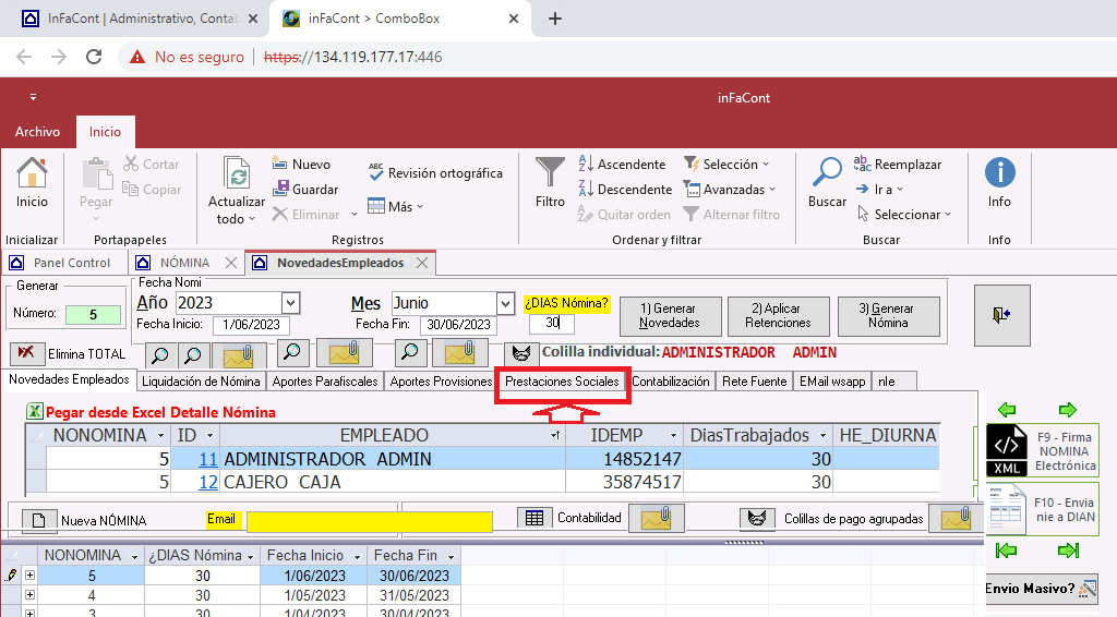 Ahora ubique la pestaña Prestaciones Sociales Para proceder a genear los informes de prestaciones sociales de los empleado de la empresa |