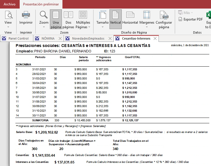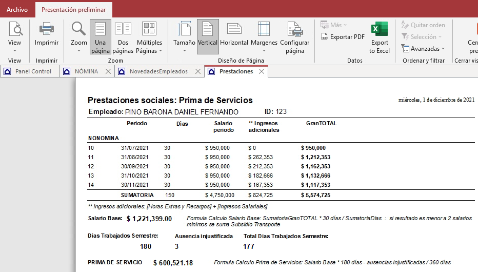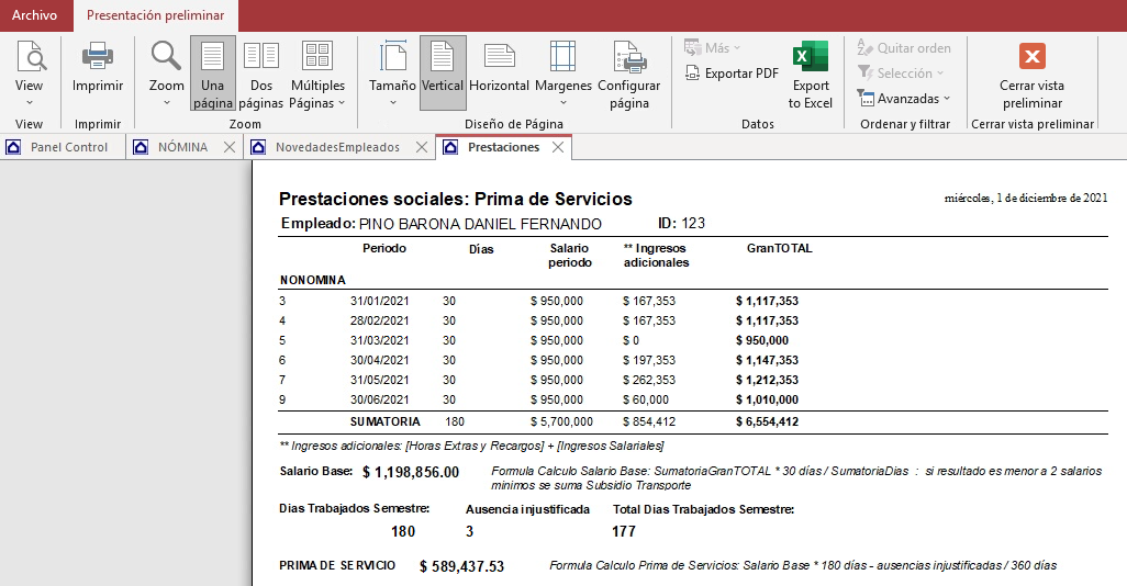 Clic nuevamente en el botón, para previsualizar el informe de prima del empleado seleccionado