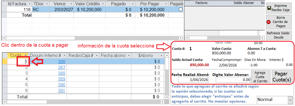 - En el subformulario de cuotas seleccione la cuota a pagar