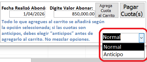 Todo lo que agregues al carrito se añadirá según la opción seleccionada; si las cuotas son anticipos, debes elegir “anticipos” antes de agregarlo al carrito. No mezclar opciones.. |