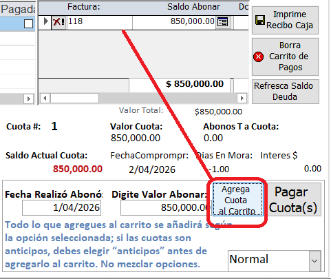 "No puede mezclar cuotas normales y anticipos"