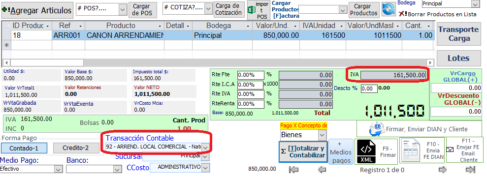 Automáticamente genera la factura electronica y segun el perfil del arrendador cobra impuesto, retenciones, etc y contabiiza