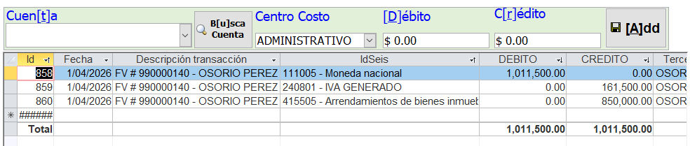 Cr 415505 Ingresos arrendamiento $850.000 |