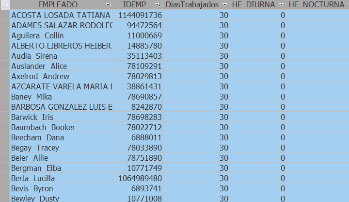 Así se verá toda la hoja seleccionada, al final de la hoja de Excel no se selecciono ninguna fila vacia se seleccionó sólo hasta el último empleado