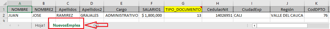 Para reportar nuevos empleados, la plantilla trae 2 hojas. Cambiarse a la hoja de Reportar nuevos empleados y diligenciarla