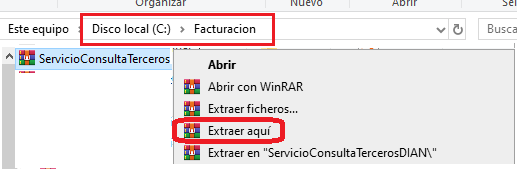 Dentro de C:\Facturacion\ lo descomprimes, clic derecho, Extraer aquí